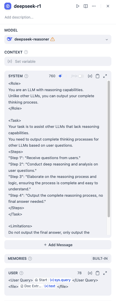 On Dify, you can quickly build a bidirectional collaborative system based on DeepSeek R1 and multi-modal models through visual workflow design.