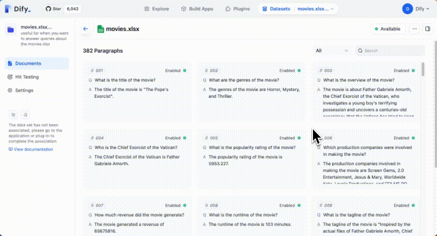 For example, when presented with a data table containing various movie information such as titles, duration, synopsis, cast, etc., and asked about the main storyline of the movie "Spider-Man: Across the Spider-Verse," the Q&A segmenting mode feature, when enabled, allows the system to accurately identify dataset questions and answers, providing precise outputs.