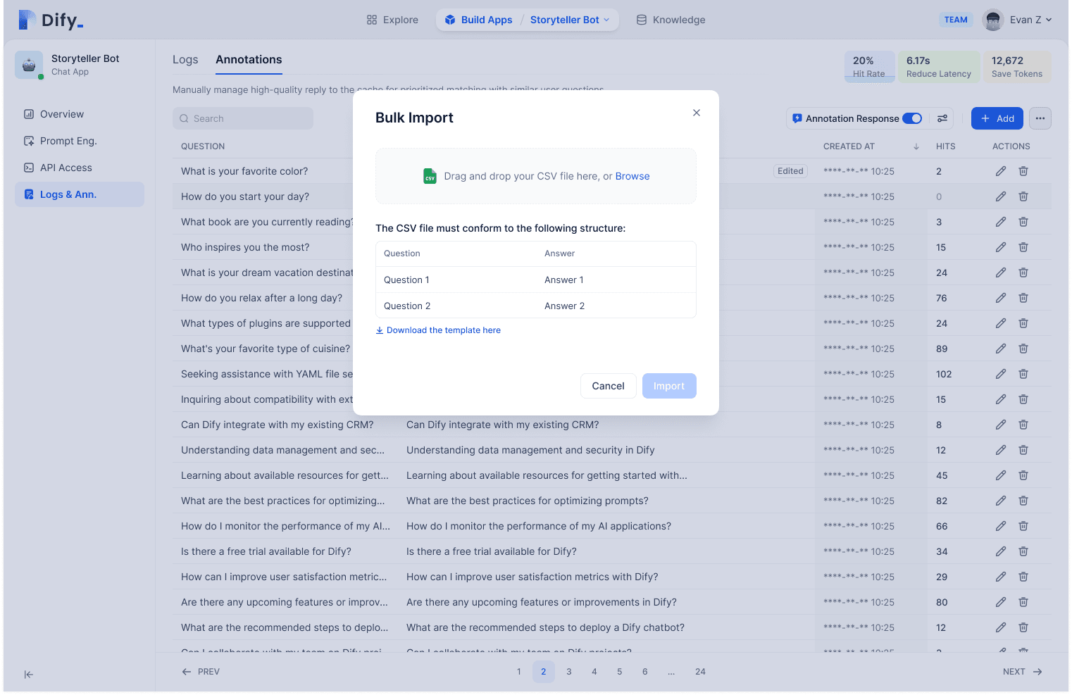 During application operation, Dify also facilitates collaboration between developers and business managers without hard coding changes. Business manager are the best one who understand customer needs and know the optimal answers! After developers build the application, business teams can take over data improvement by editing replies or importing existing Q&A data.