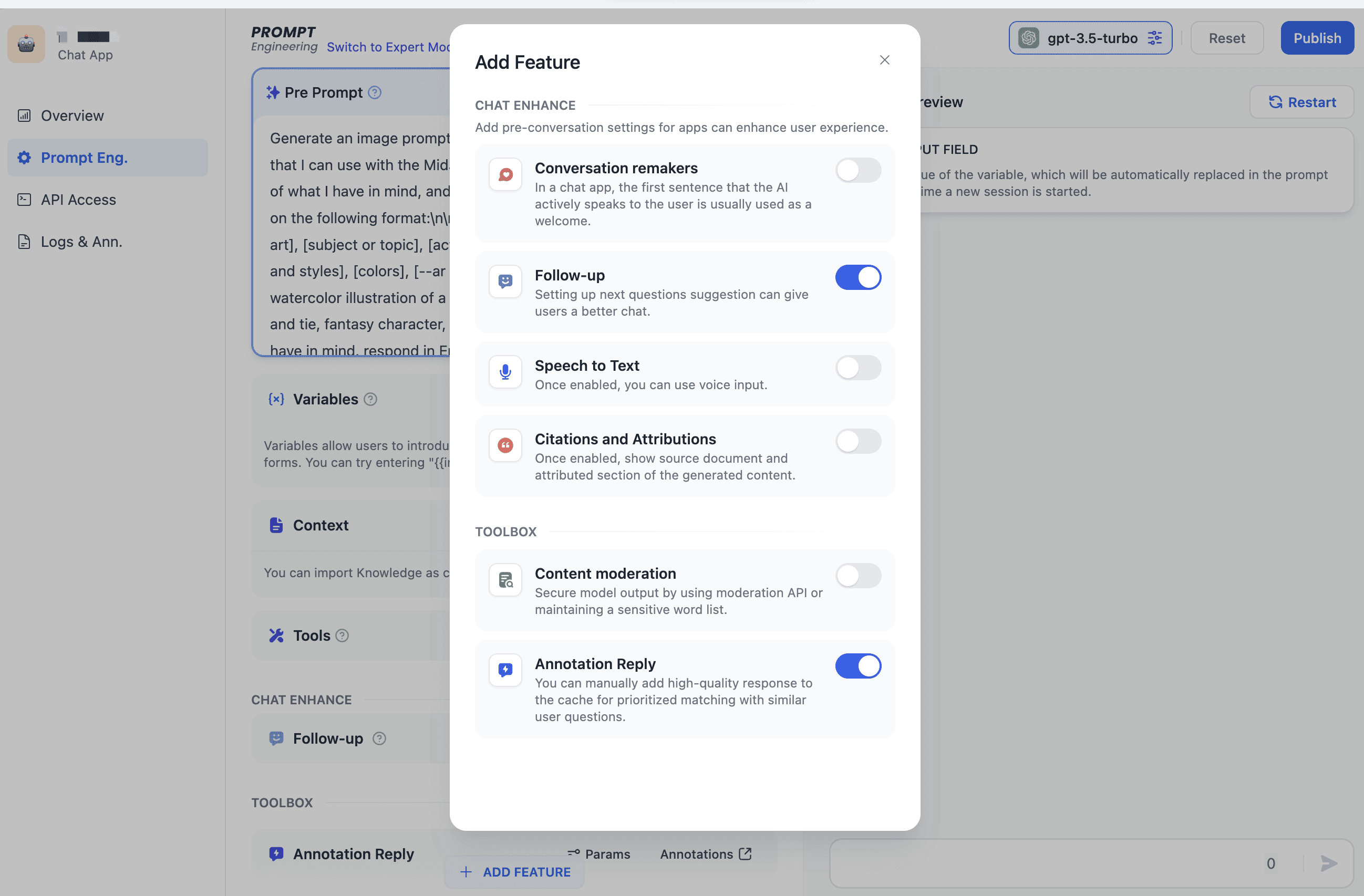 prompt engineering --> Add feature(currently only supported for chat apps). LLM reply content can then be annotated in LLM apps debug process or logs. High-quality LLM replies can be added directly or edited as needed before being persisted.
