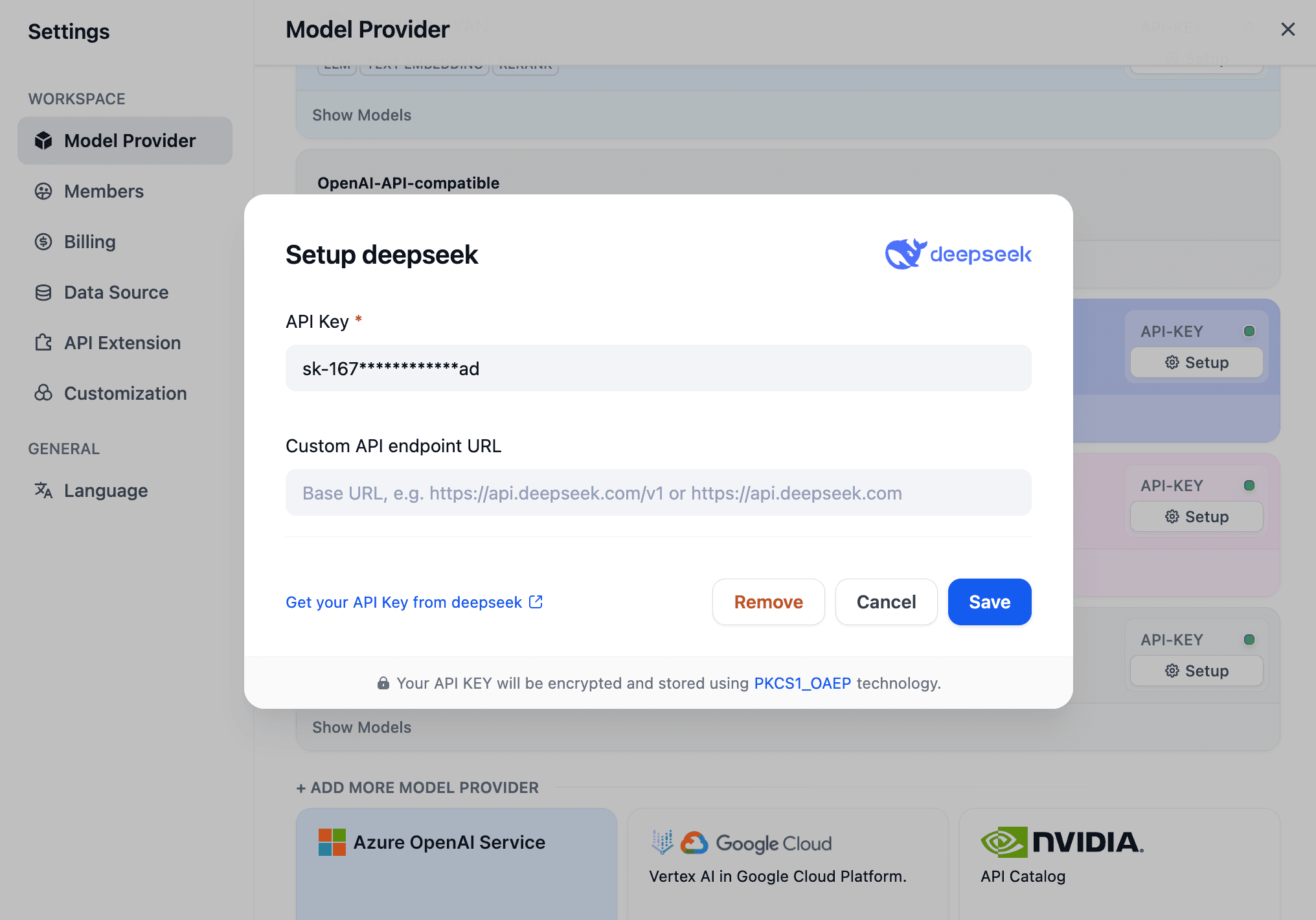 Configure in Dify: Go to "Model Providers," find DeepSeek, and paste your key.