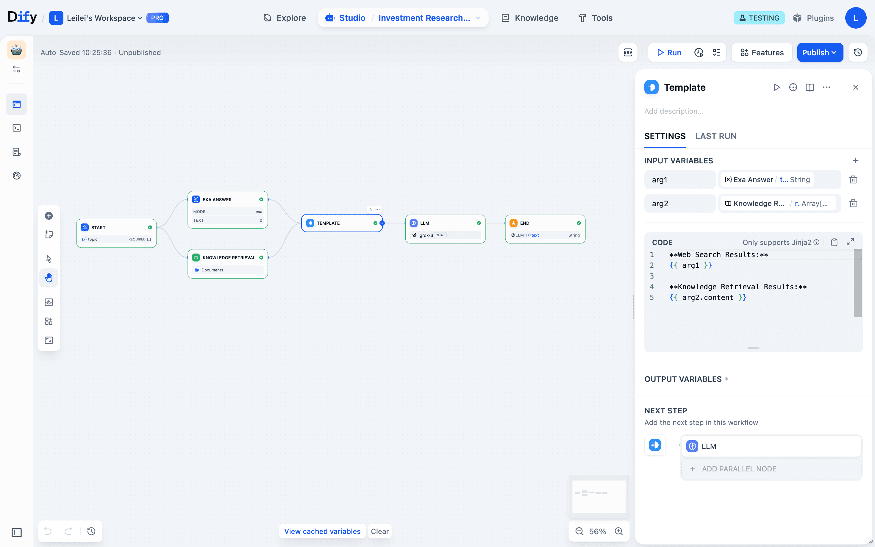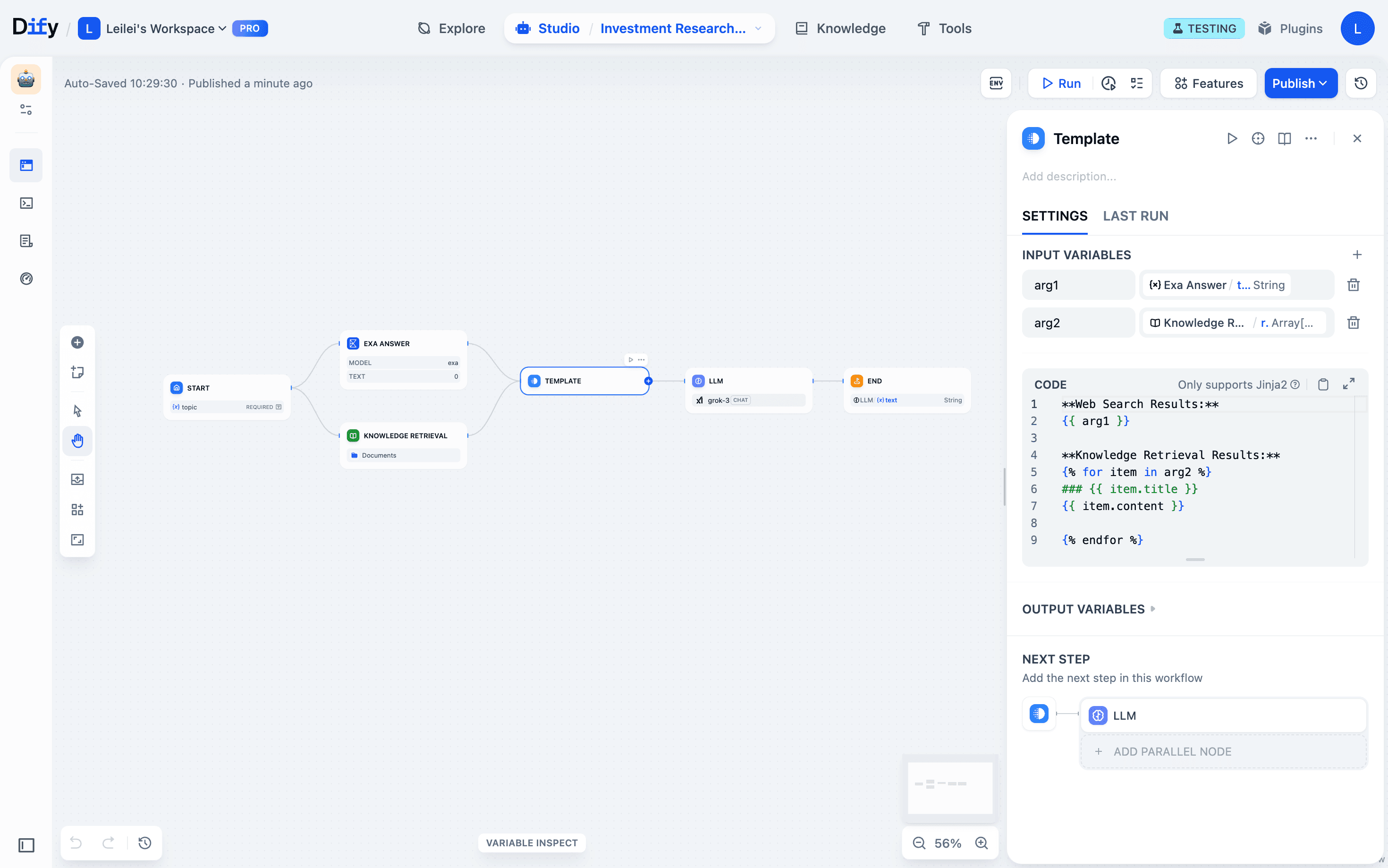 Spot issues: The variable inspect panel shows you immediately that Exa web search worked fine, but the template node output is missing knowledge base content.