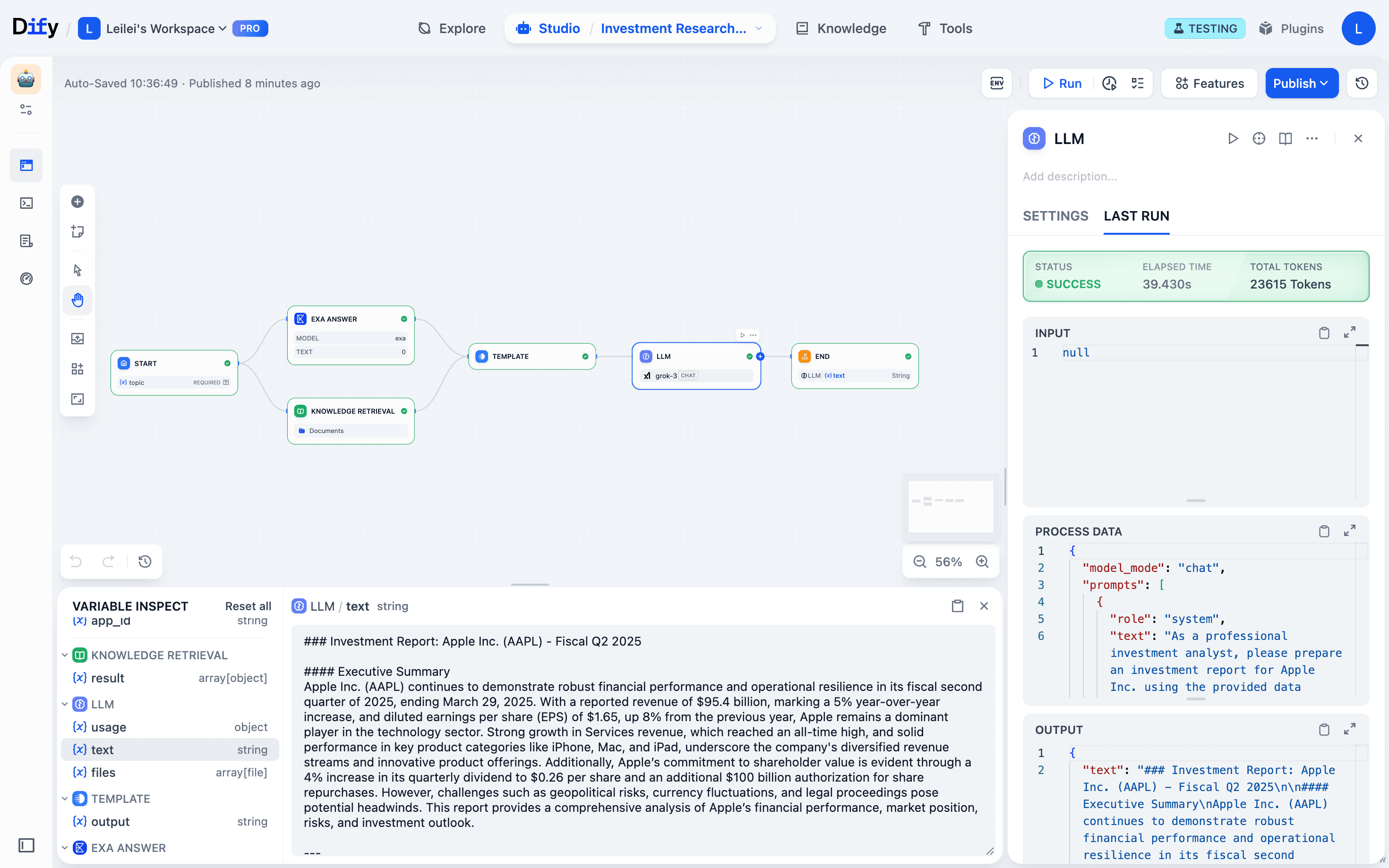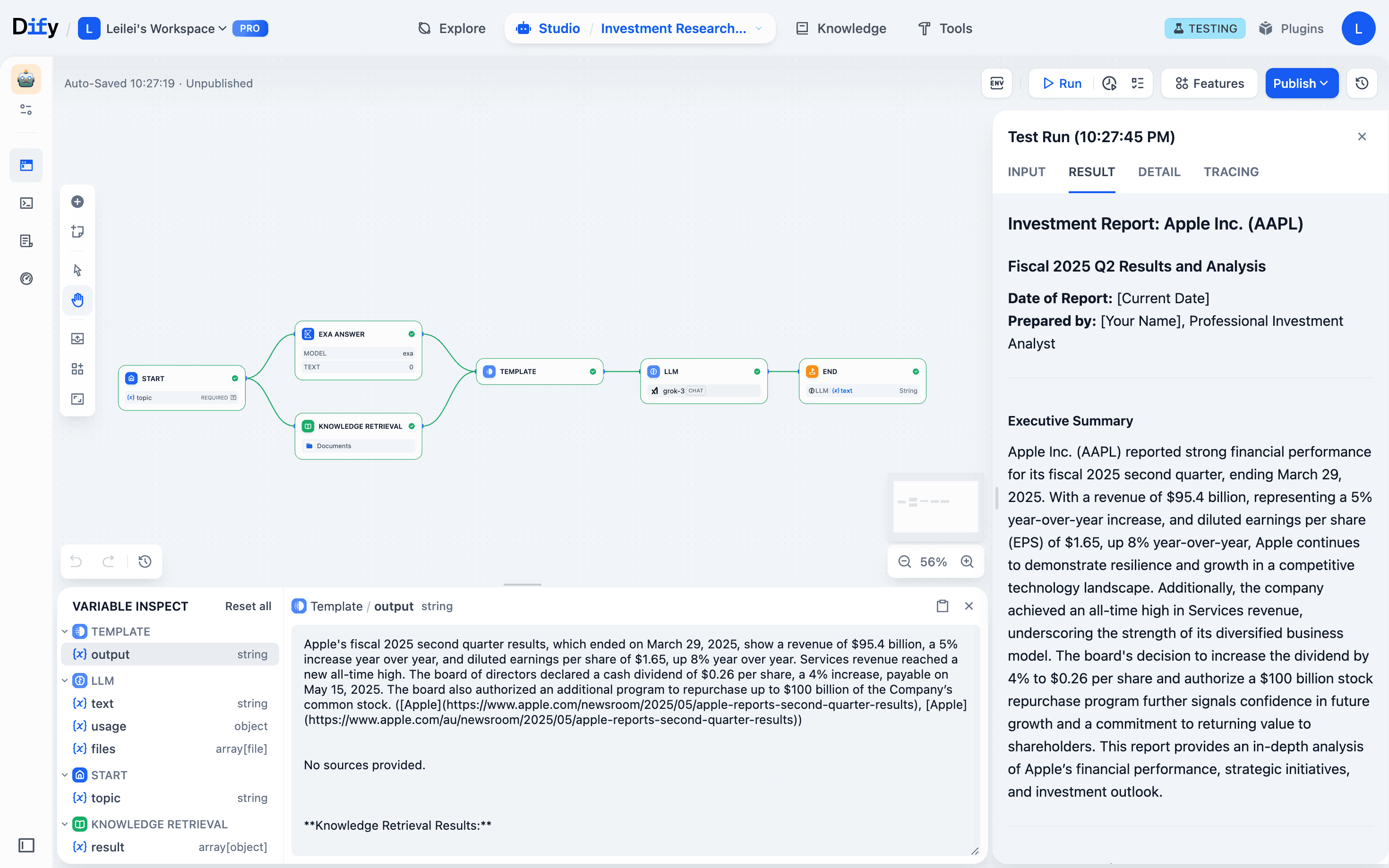 Start → Knowledge retrieval pulls financial reports from our database & Exa web scraper grabs internet data (parallel) → Template node merges content → LLM processes everything → Final output