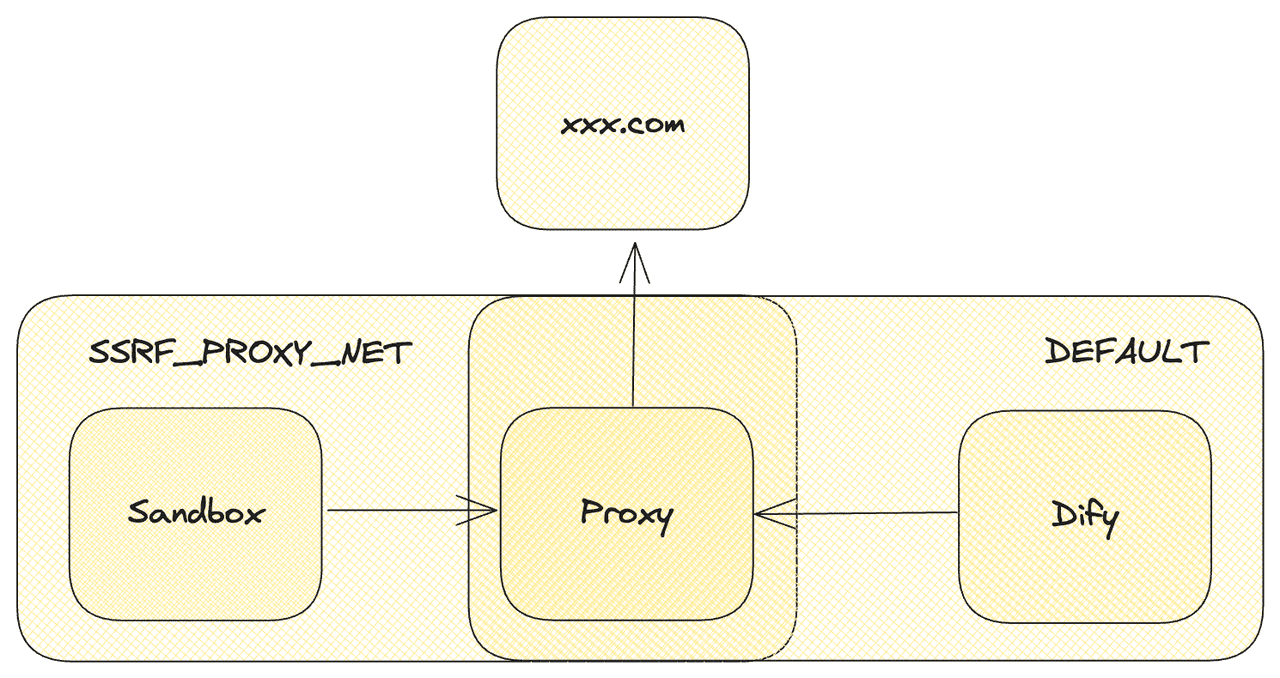 SSRF_PROXY_NET, which is an internal network that cannot access external resources. Theproxycontainer is also within this network and theDEFAULTnetwork. This setup allows theproxyto act as an intermediary for accessing external networks and enables the configuration of highly flexible networkproxyrules to ensure intranet security.It's worth noting that Dify itself also utilizes a