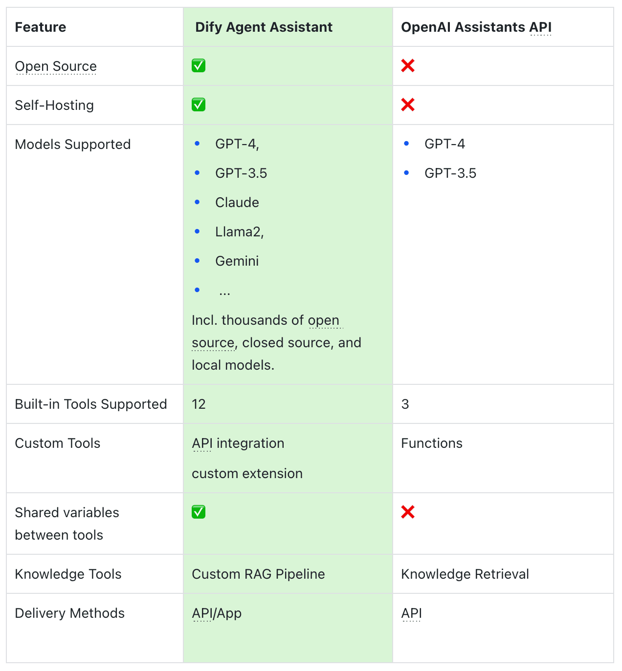 OpenAI Assistants API lets developers create advanced AI Assistants using OpenAI's models. Meanwhile, Dify, an LLM app development platform that's big on openness, supports all sorts of LLMs, including those that are open-source. This means you're not just stuck with OpenAI's models; you've got a wider range to choose from for different AI Agents.