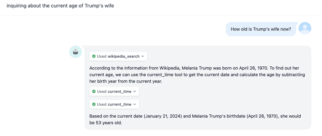 For example, let's say we ask, "How old is Trump's wife now?" Currently, an LLM doesn't have the ability to give her current age from its own database. But don't worry, we have a couple of effective tools to help: 'Wikipedia_search' and 'current_time'. Here's the step-by-step breakdown of how it tackles the question: