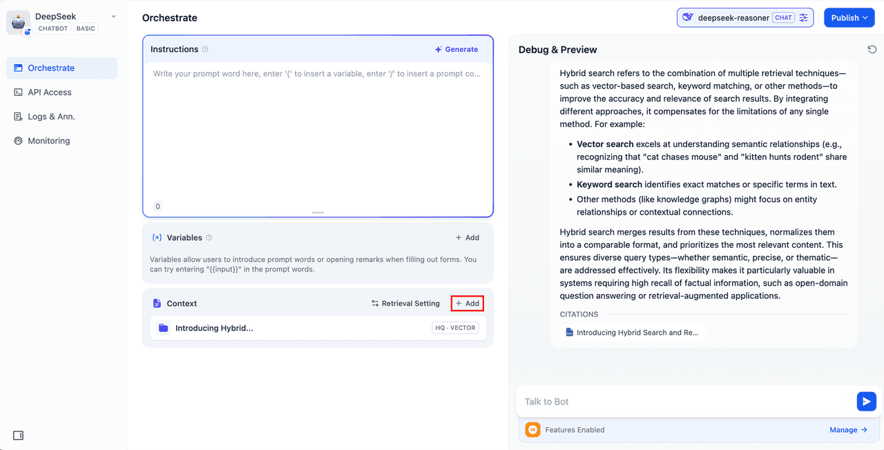 Add the knowledge base to the "Context" section of your AI app, then enter your query in the chat window. The LLM will first retrieve context related to the question from the knowledge base, summarize it, and generate a higher-quality response.