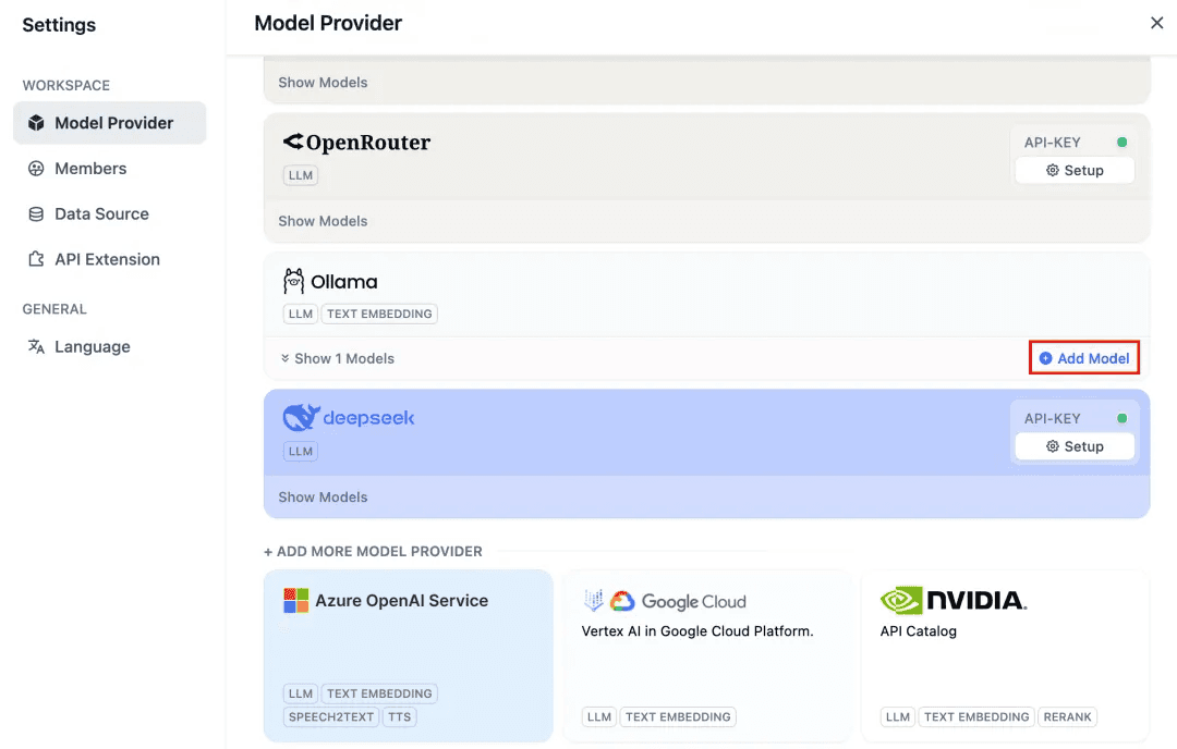 On the Dify platform, click the Profile → Settings → Model Providers in the top-right corner, select Ollama , and click “Add Model.”