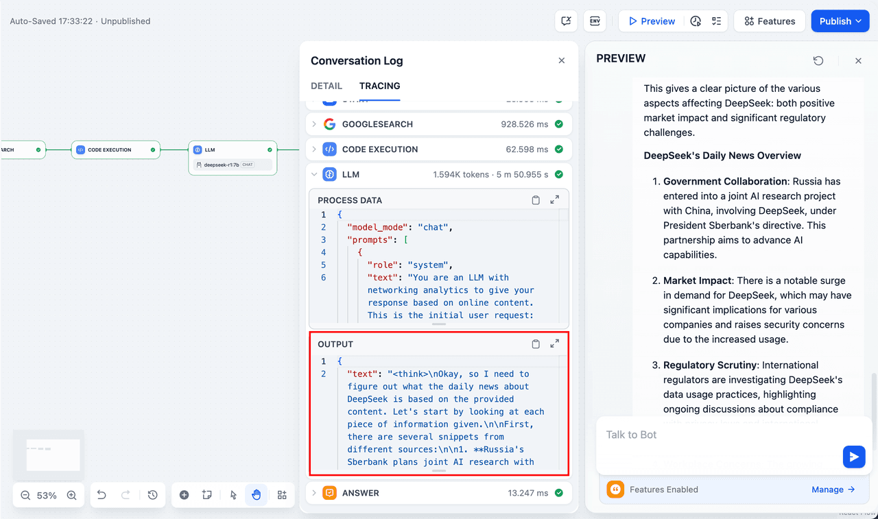 5. Finally, add an End node that references the output from the LLM node. Test your setup in the preview window; if you get a response, your app is ready, and you can inspect the LLM’s reasoning process in the logs.