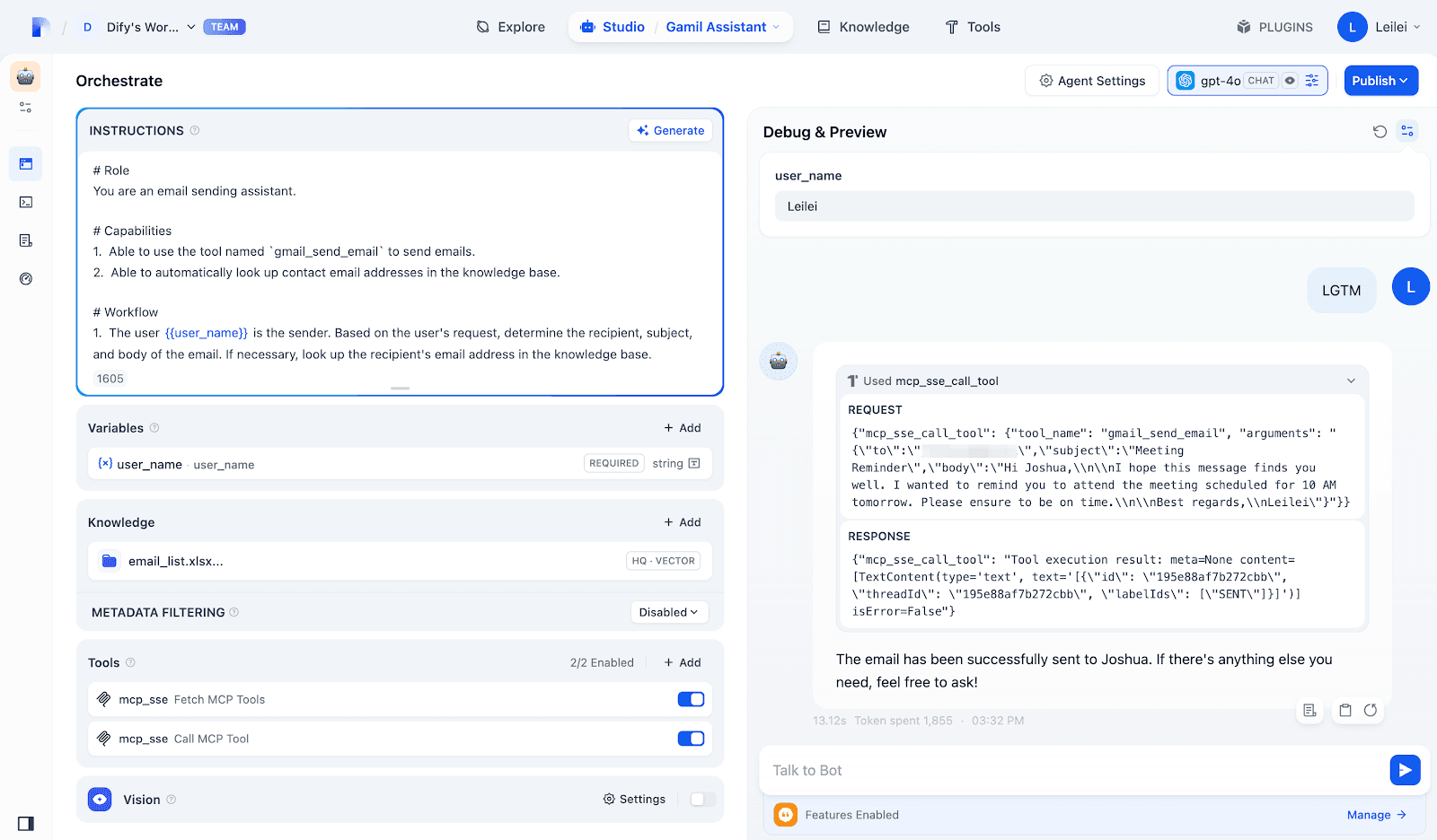 After configuring, create a new Agent app and enable your MCP SSE plugin in the "Tools" section. Your Agent will intelligently invoke relevant tools based on user intentions—for example, automatically drafting and sending emails via integrated Gmail actions.