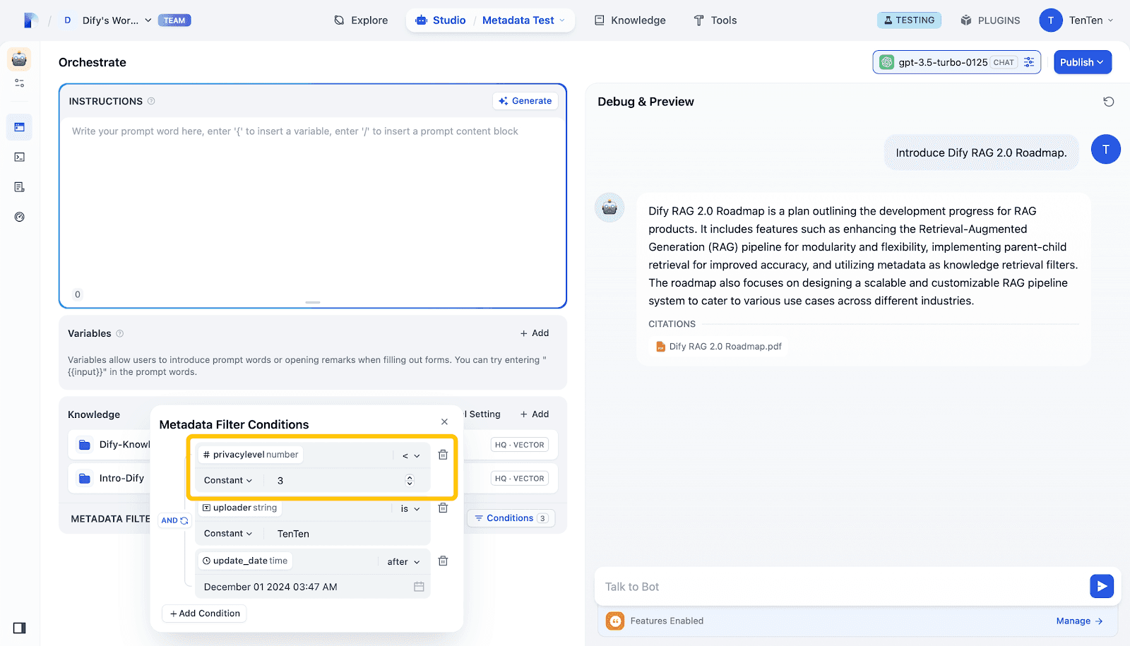 Hi, I'm Yawen from the Dify product team. Today, we're excited to launch Dify v1.1.0 with the new features of Metadata as a Knowledge Filter. Metadata filtering enhances the retrieval and accuracy of relevant data in knowledge bases by leveraging custom metadata attributes. Previously, users had to search through an entire vast dataset without the ability to filter or control access based on specific needs, making it difficult to narrow results to the most relevant information. With metadata, data is essentially tagged and categorized, significantly improving retrieval efficiency and accuracy. This concept is particularly significant in the context of RAG(retrieval-augmented generation) , where vast amounts of information need to be efficiently managed and accessed.