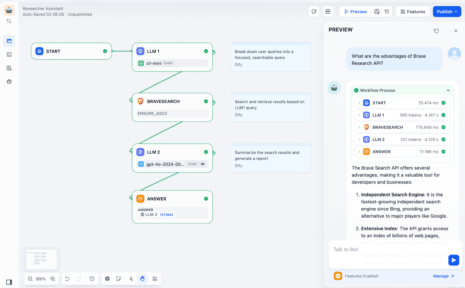 For more sophisticated AI applications, Dify Workflows provide a structured and modular framework. Let's create a research assistant workflow as a practical example: