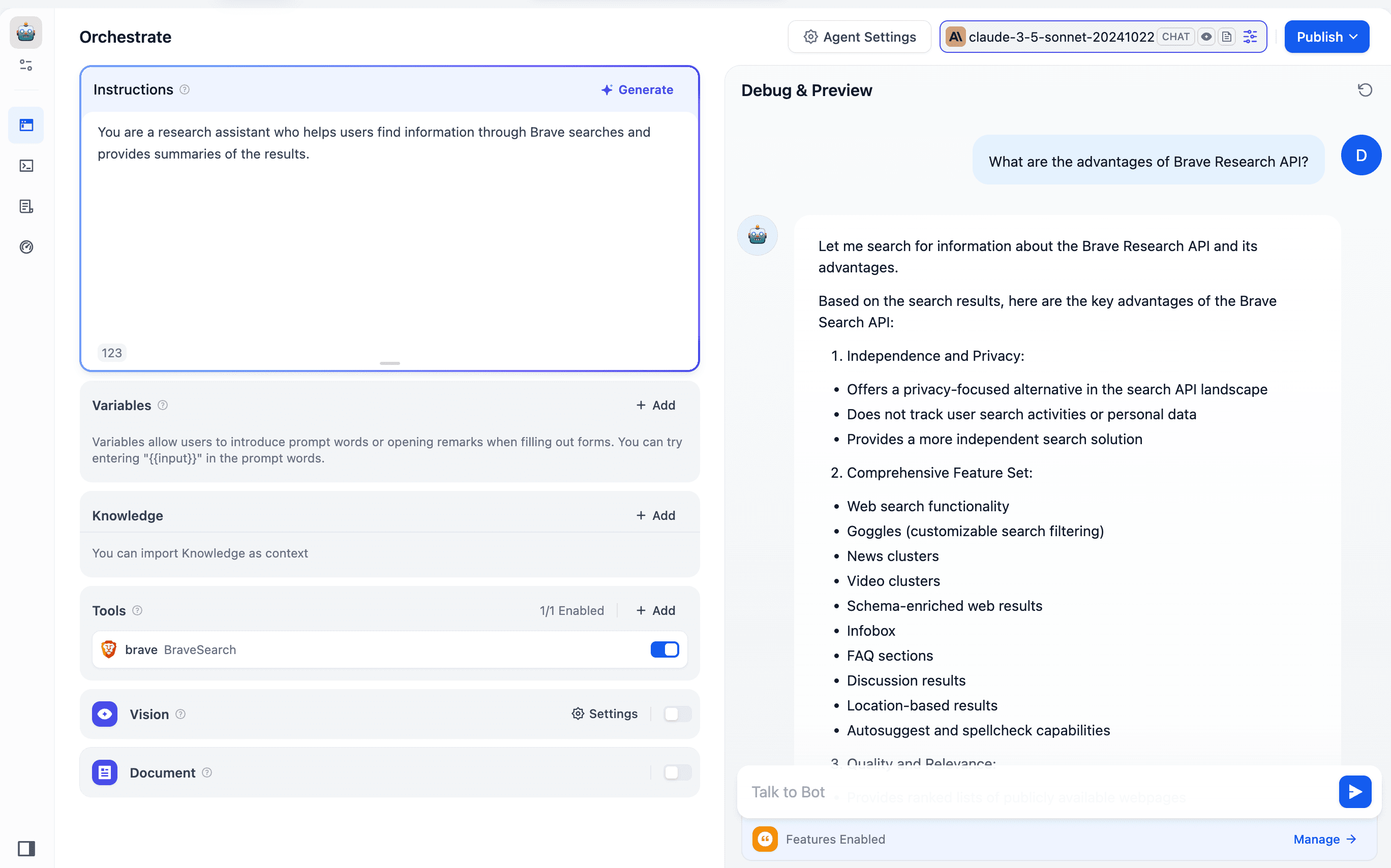 Add the Brave Search Tool: Select "Brave Search" to activate search functionality for your agent.