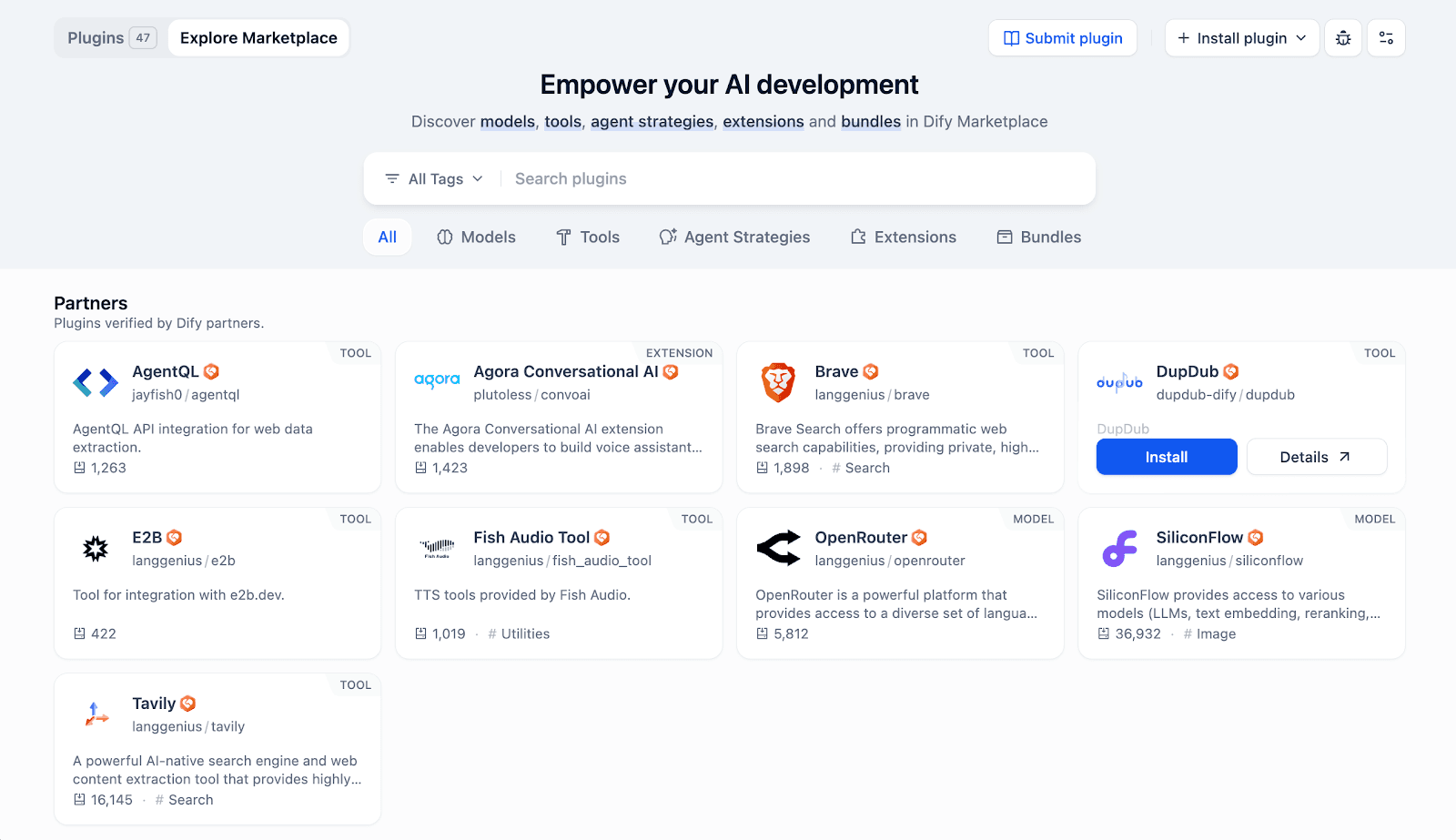 Launched alongside Dify v1.0.0, our Marketplace is rapidly growing into a vibrant ecosystem built upon our open-source AI application development platform. Hosting a diverse range of plugins like Models, Tools, Agent Strategies, Extensions, and Bundles, the Marketplace empowers Dify users to innovate and scale AI solutions faster. Its modular design makes it the ideal environment for integrating cutting-edge tools like those from DupDub, further enhancing the multi-modal capabilities available within the Dify community.