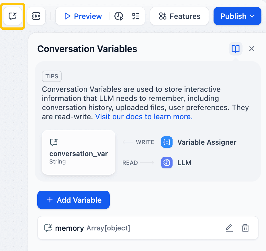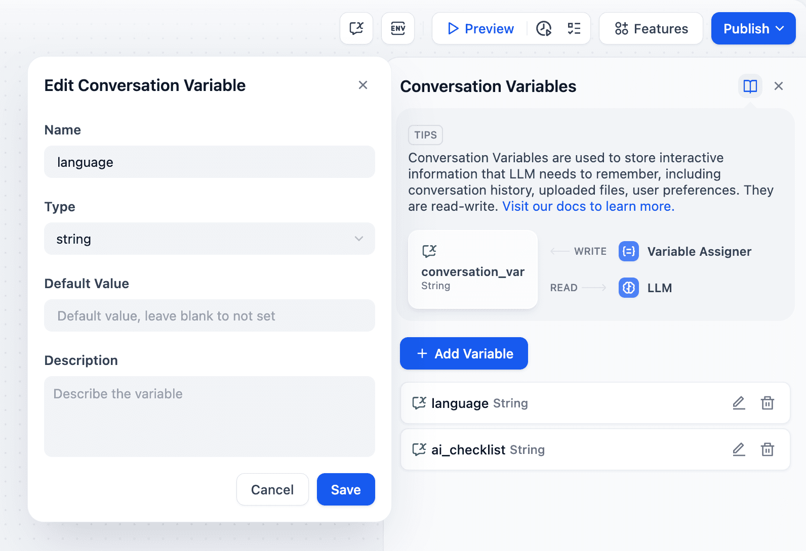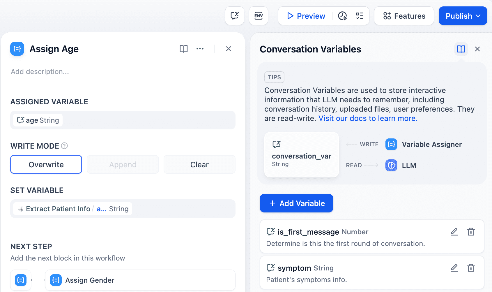 Workflow integration: Write or update variables anywhere in the Chatflow for downstream LLM nodes to access.