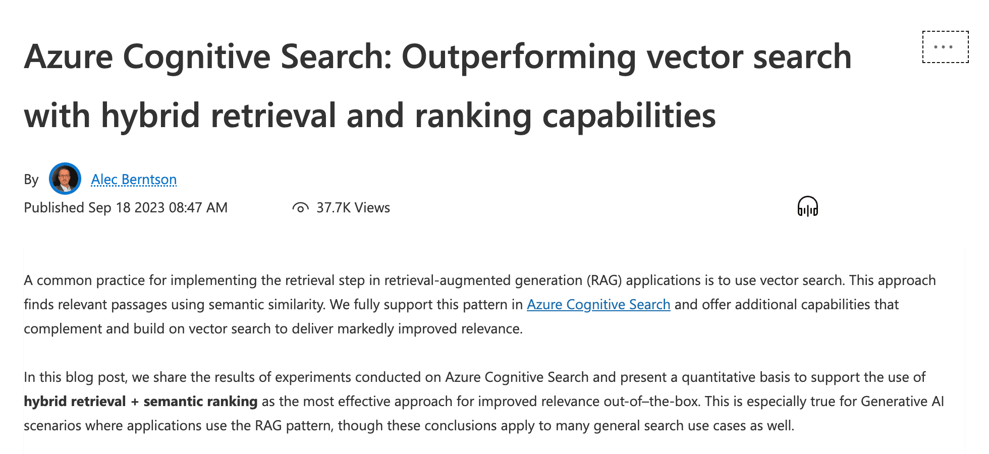 In September, Microsoft Azure AI released a blog post titled "Azure Cognitive Search: Outperforming vector search with hybrid retrieval and ranking capabilities." This article offered an in-depth evaluation of experimental data on implementing Hybrid Search and re-ranking technologies in generative AI applications utilizing the RAG architecture. It quantified the notable enhancements these technologies contribute to document recall and accuracy.