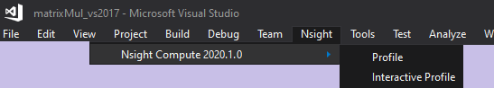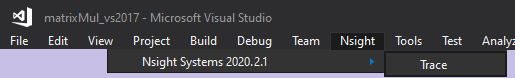 When any of these tools are installed along with NVIDIA Nsight Integration, commands to access these tools will appear under the NVIDIA Nsight menu in the Visual Studio menu bar.