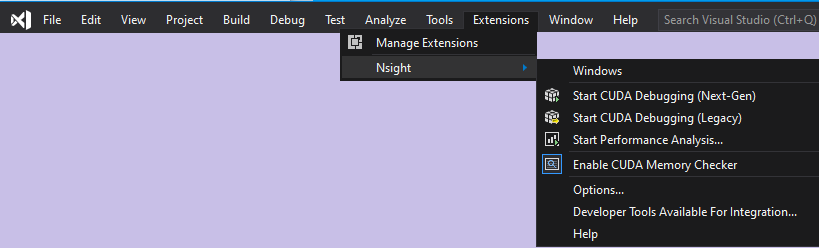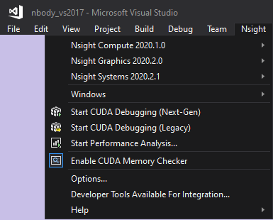 Prior to NVIDIA Nsight Integration version 2020.1, the Nsight menu was reserved for NVIDIA Nsight Visual Studio Edition's integrated build and Next-Gen CPU/GPU debugging along with functionality now provided by the standalone Nsight tools mentioned above. While the functionality of the standalone tools is being moved out of NVIDIA Nsight Visual Studio Edition, the CUDA Debugger and code correctness tools will remain.