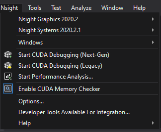 Separate versions of a given NVIDIA Nsight tool (for example, Nsight Graphics 2020.1, Nsight Graphics 2020.2) have individual entries in the menu. If you do not wish to have multiple entries, you may either use the NVIDIA Nsight Integration visibility control as described above, or uninstall the version if you do not wish to have it on your system at all.