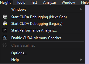 Note that uninstalling an individual tool, will remove this tool from the Nsight Visual Studio Extension and the tool will not be shown under the Nsight menu. For example, if Nsight Compute, Nsight Systems and Nsight Graphics are installed, then Nsight Compute is uninstalled, Nsight Compute will no longer appear in the Nsight menu, as shown to the right. |