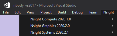 If NVIDIA Nsight Visual Studio Edition is installed, its menu items will also be present (not shown here).