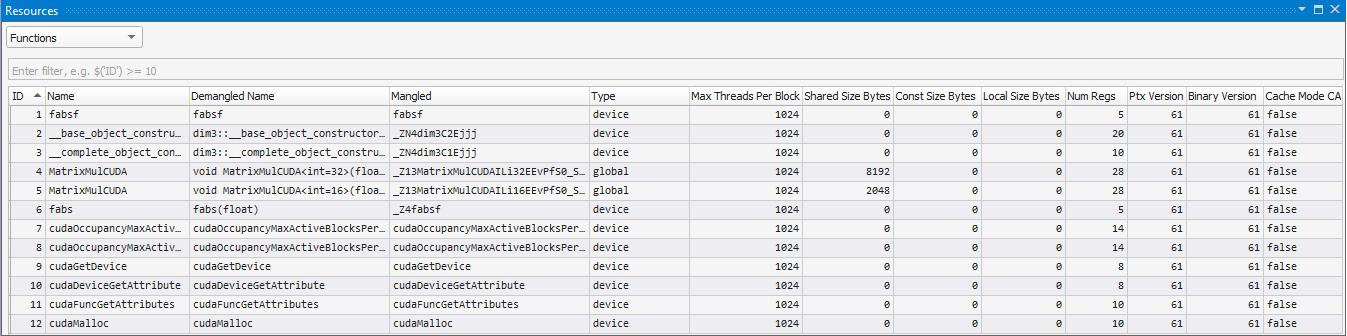 • A list of devices and their info, such as ID, Name, Description, SM, Number of SMs, Number of Warps, Number of Lanes.