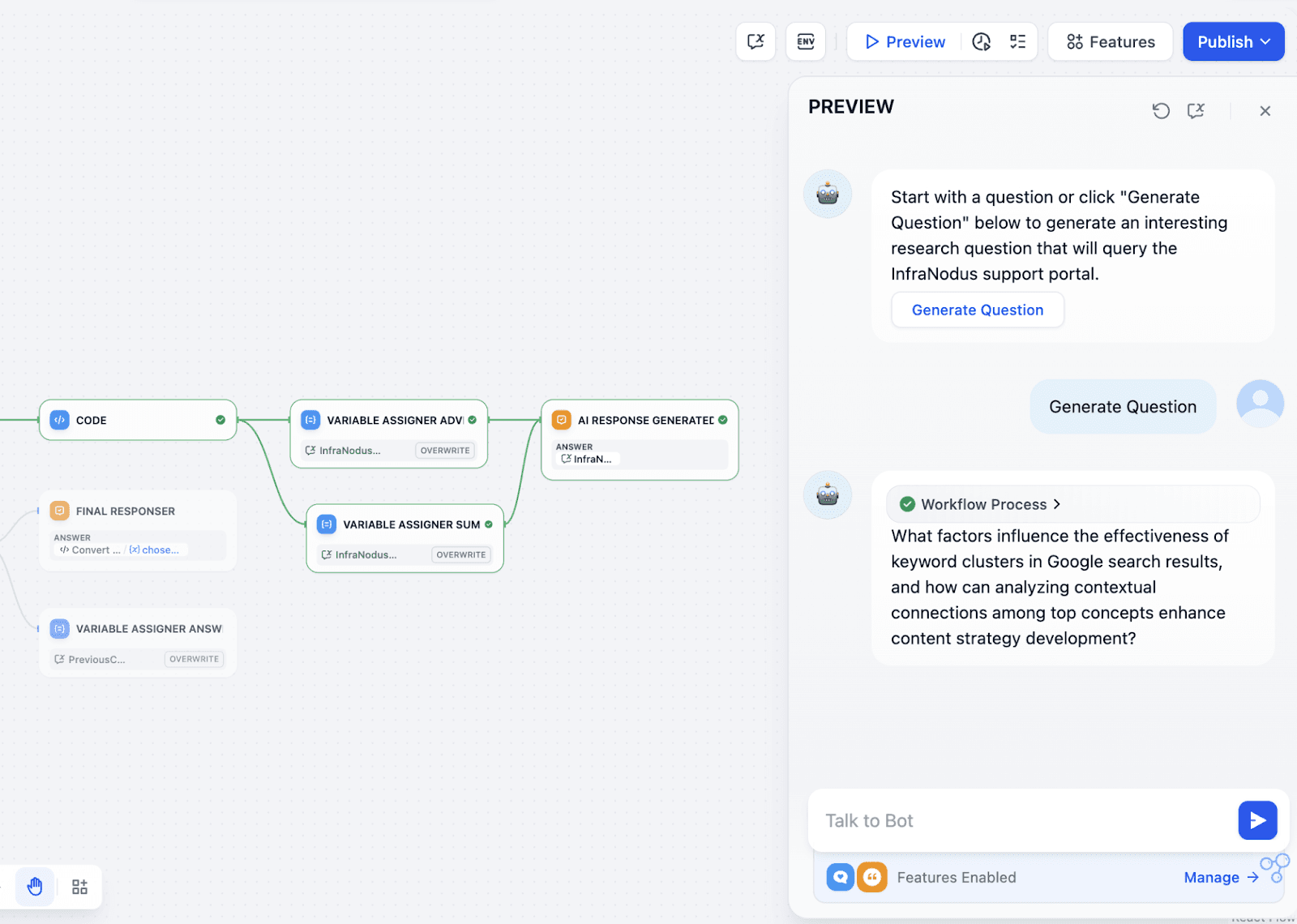 In the chatbot's Features > Conversation Opener, add a Conversation Opener in the chat's Features panel that says "Generate a Question". When the chat opens to the end user, they will be able to click this button to automatically generate a question with InfraNodus. If they don't generate a question, they can ask a free-form question, which will be forwarded to InfraNodus as a prompt.