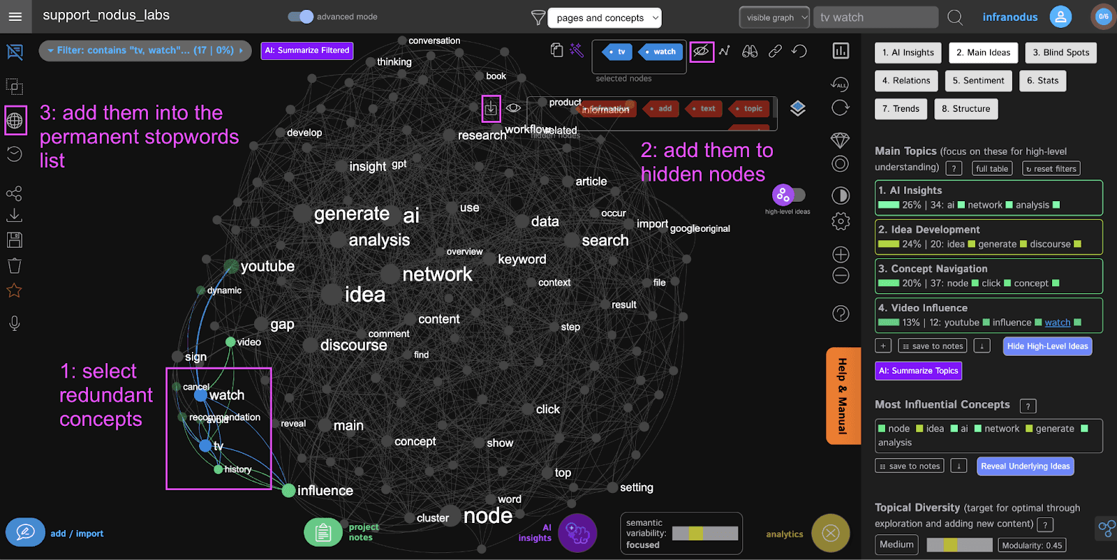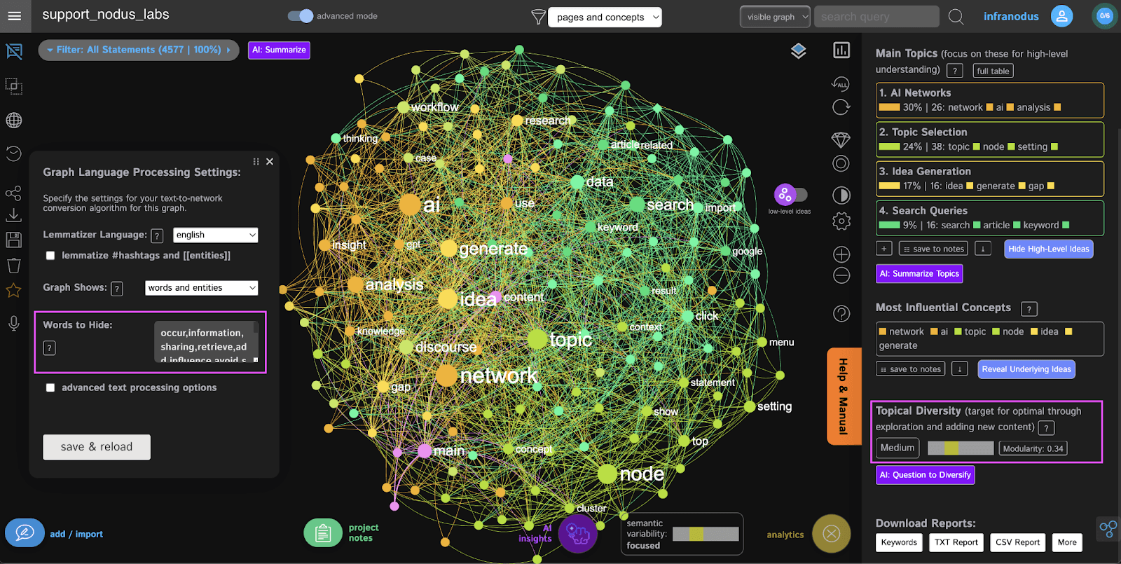 Before integration, it's often beneficial to refine the knowledge graph. In InfraNodus's Analytics Panel, check the Topical Diversity metric. If it's 'Low', the graph might be too focused on overly general concepts (like "graph" or "infranodus" in this example), leading to generic AI responses.
