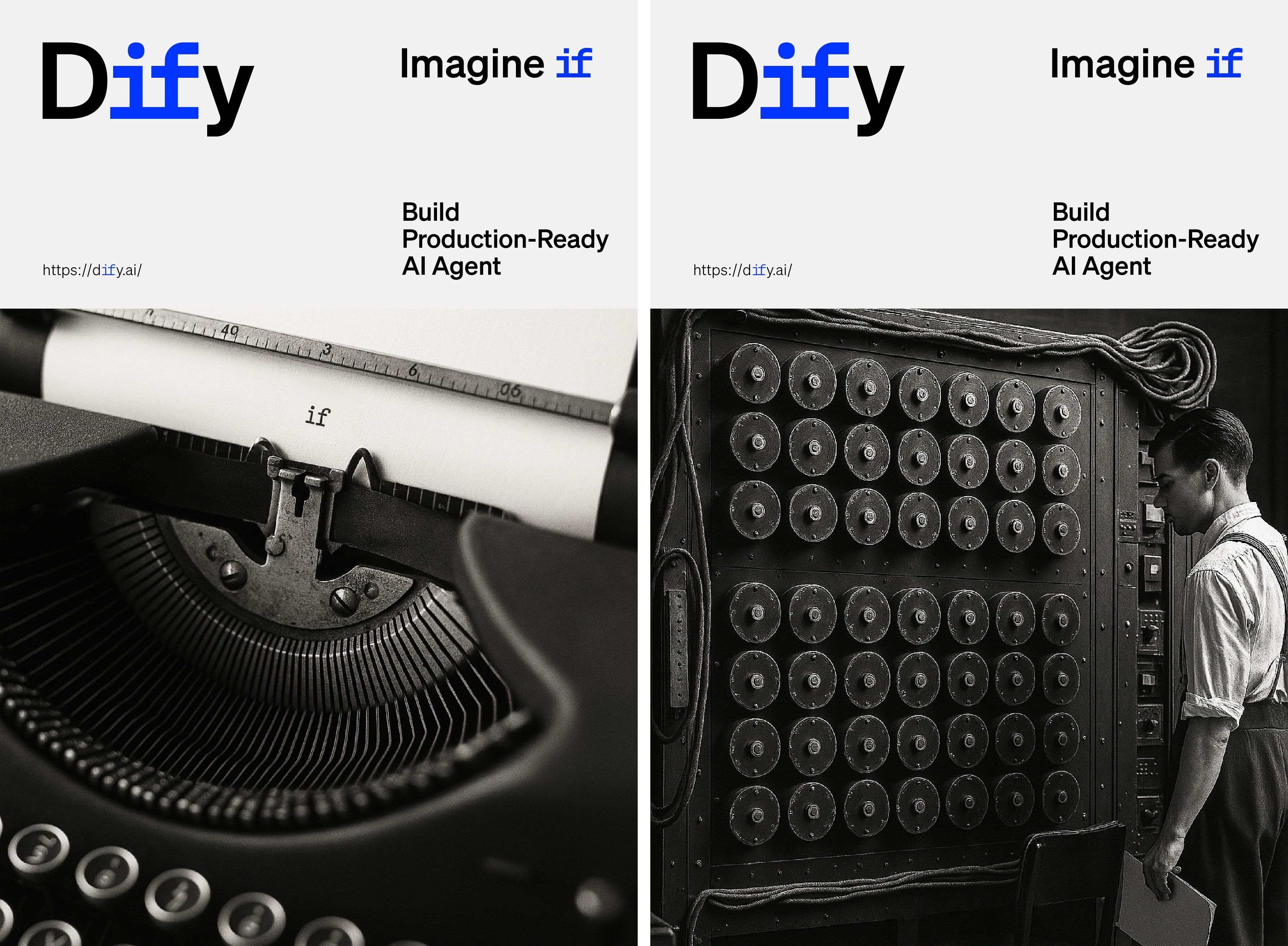 We separate "if" from "Dify", and turned "if" into a more thoughtful, retro typewriter font for it. This symbolizes a connection to foundational ideas and intellectual curiosity. The "Dy" retains a modern, sans-serif feeling, representing futurism and momentum forward. This design bridges the past and the future, reflecting our approach to technology within an infinite hypothesis of possibilities – one that is rational and measured.