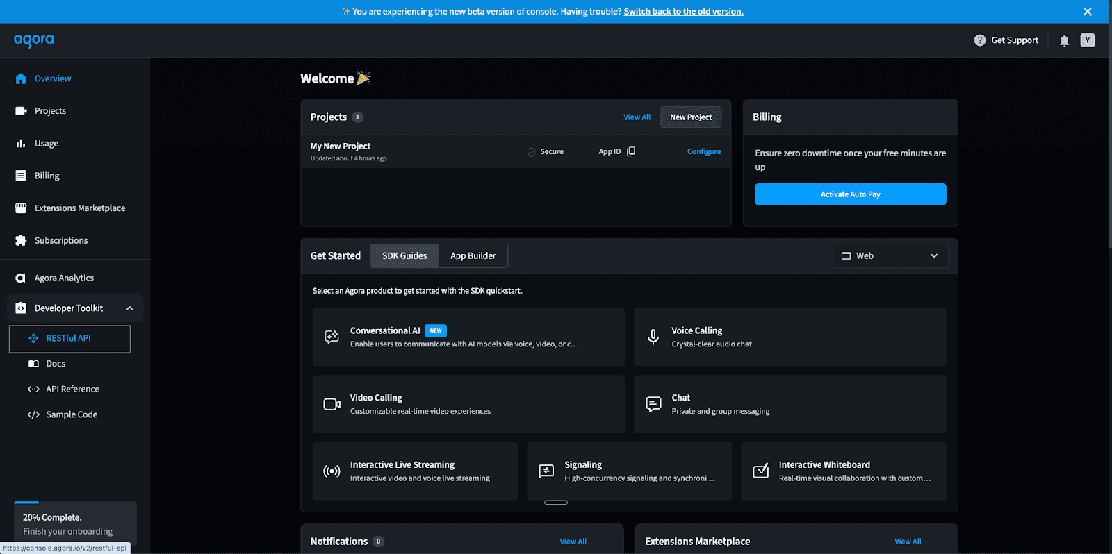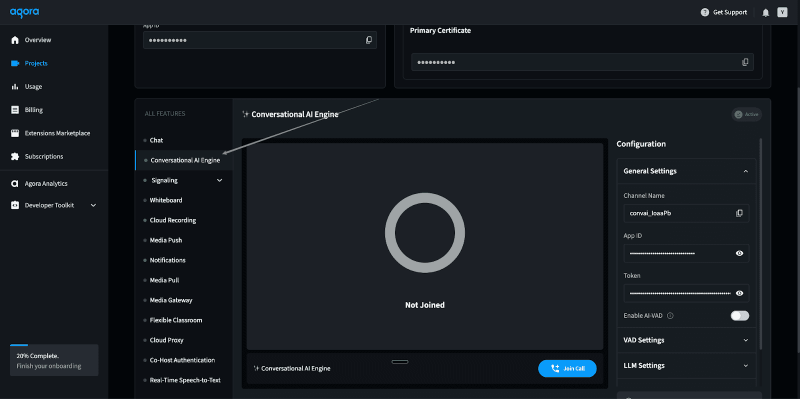 Note: You will need to turn on the “Conversational AI” feature in the Agora Console.