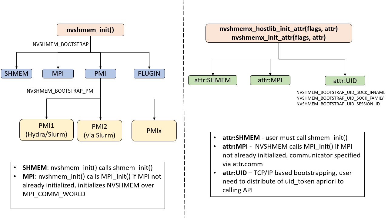 The NVSHMEM library can be initialized either by nvshmem_init or