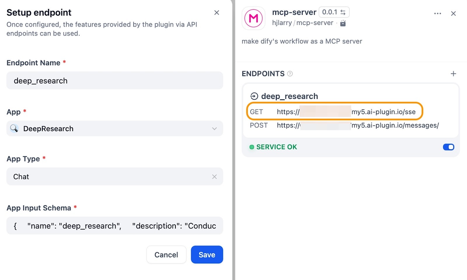 Leverages Dify Endpoint: After creating an app endpoint, you get a unique URL that MCP clients can use to connect.