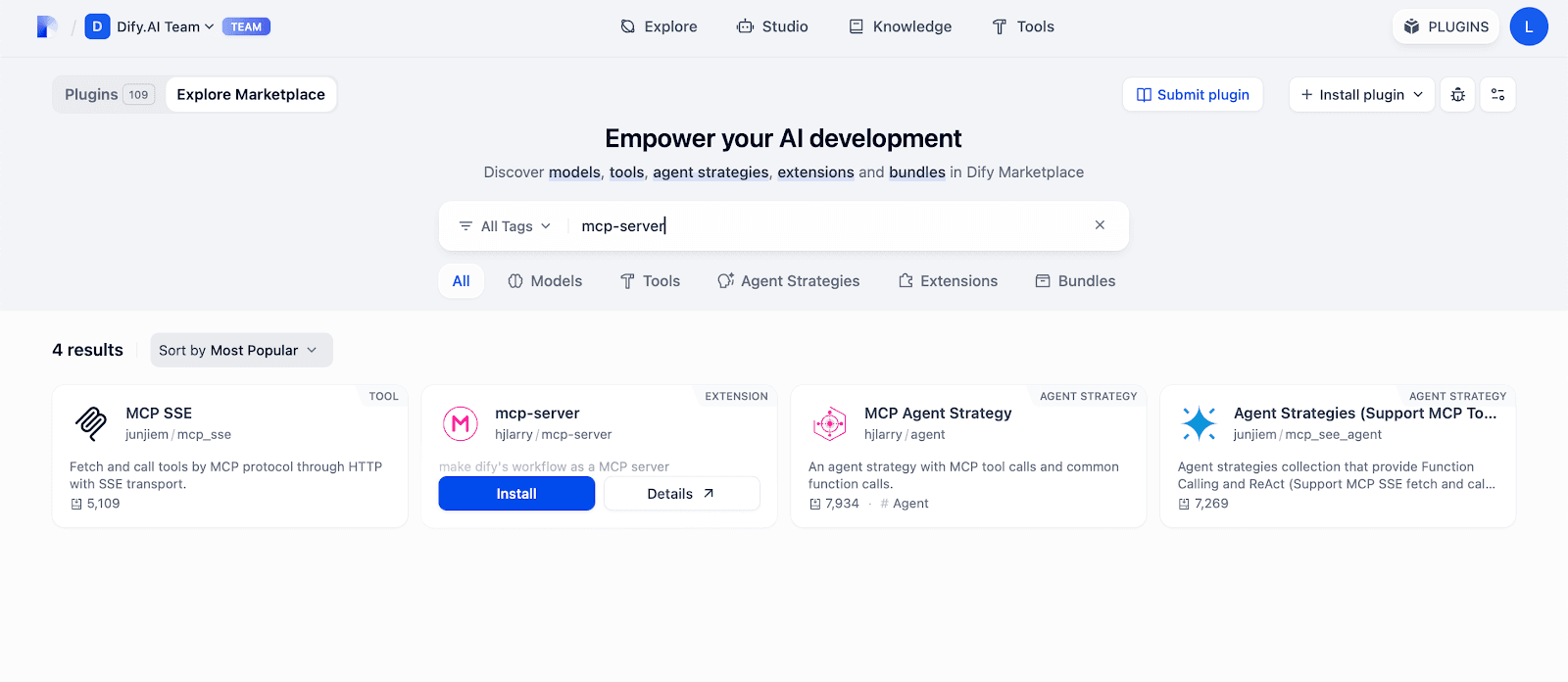 Head to the Dify Marketplace, download, and install the mcp-server plugin.