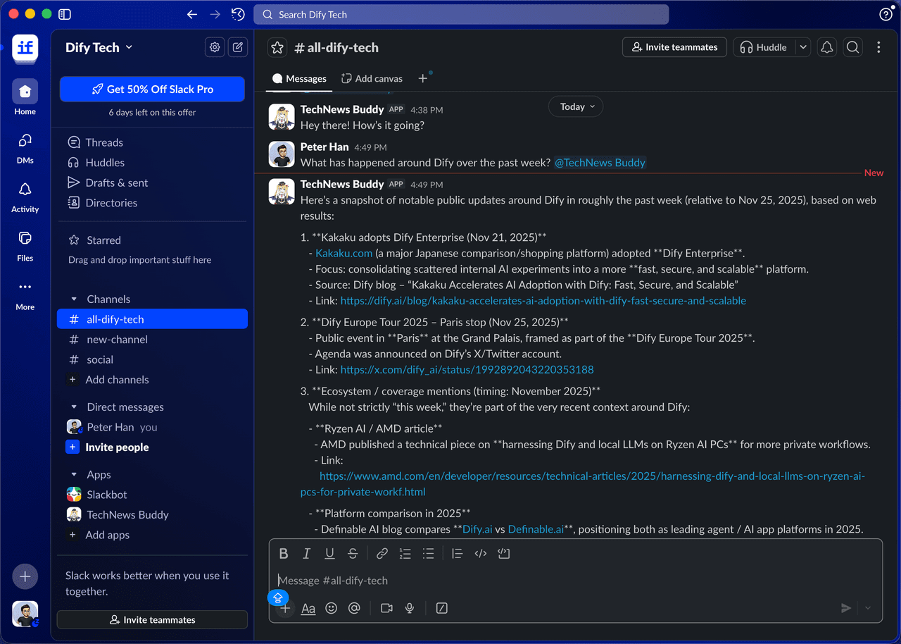 In fast-paced teams, waiting for someone to search for news, gather context, and share updates slows communication. Plugin Triggers allow workflows to react instantly when users mention an assistant inside Slack. This creates a fluid, conversational interface where team members can request insights naturally in their day-to-day communication environment — no switching tools, no extra steps.