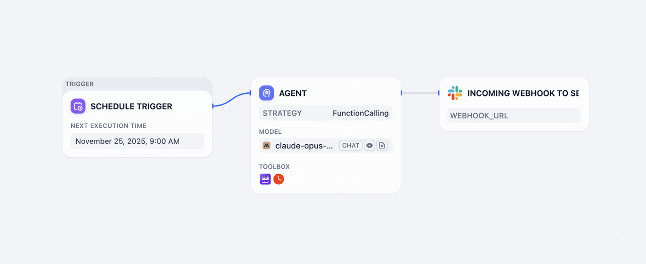 Many teams need a consistent stream of industry insights, but manually collecting, filtering, and summarizing news every morning is time-consuming and unreliable. Scheduled Triggers solve this by turning a repetitive research task into a fully automated routine that delivers insights at the exact same time every day — ensuring your team never misses important updates while eliminating manual overhead.